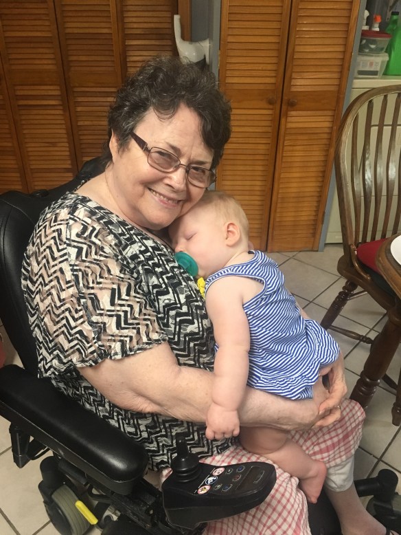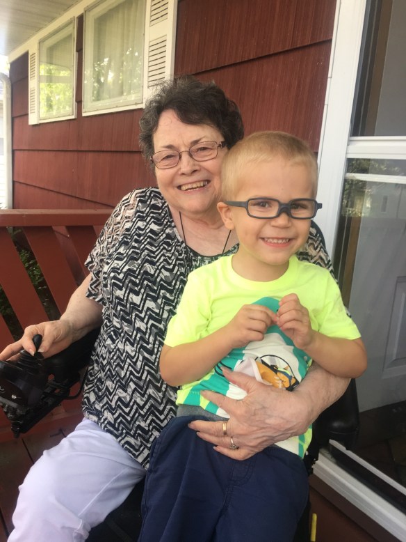 During one of our phone calls she told me about your last visit to her house. You sat in her lap and she gave you wheelchair rides. Up and down her porch into the driveway. Over and over you rode. She enjoyed your visit. I hope they continue.
